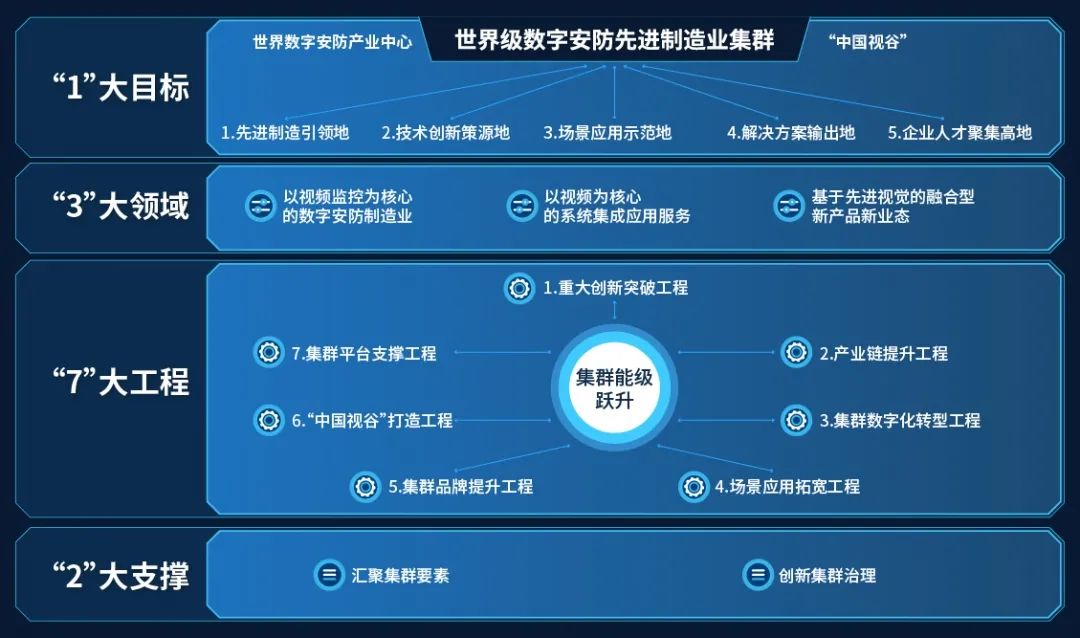 “十四五”时期,杭州提出大力建设世界级数字产业集群,推动数字产业化与产业数字化高质量融合发展。其中,壮大杭州数字安防产业集群,布局视觉智能标志性产业链,打造“中国视谷”,成为杭州建设“数字经济第一城”的关键突破口。