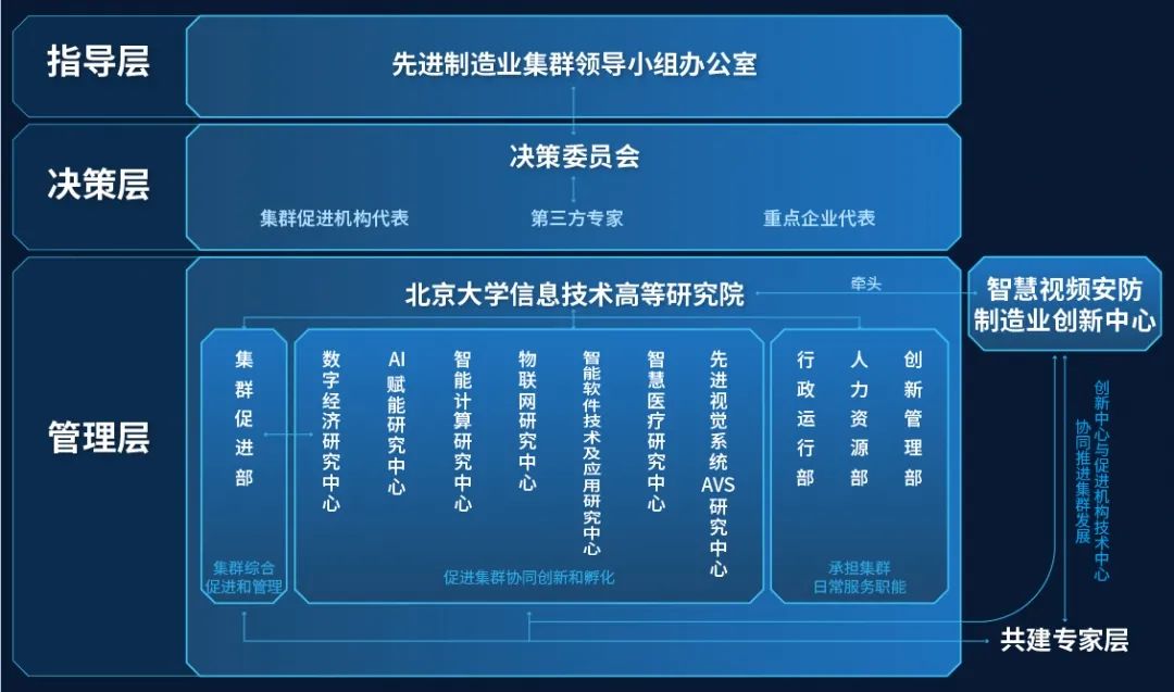 在产业发展上,集群龙头企业引领建设企业共同体,促进大中小企业融通发展,已形成从上游算法、芯片、传感器,到中游前端摄像机、后端存储录像设备、中控显示设备,再到下游系统集成、云平台、运营业务的全产业链体系。