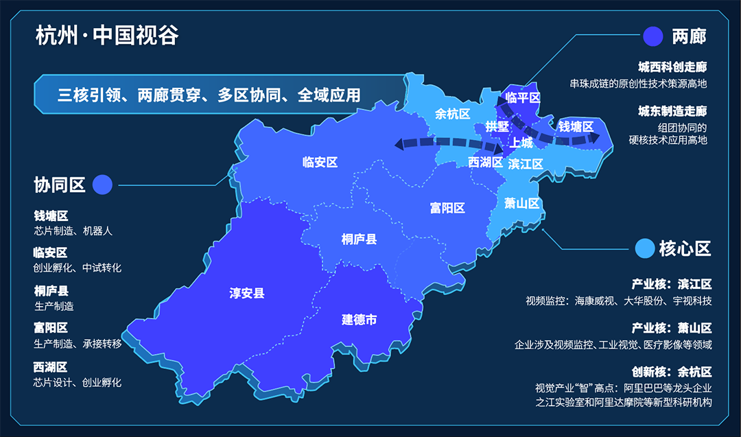 “三核”即滨江(产业核)、萧山(产业核)、余杭(创新核),“两廊”为城西科创走廊和城东智造走廊,“多区”包括钱塘区、西湖区、临安区、富阳区、桐庐县等区(县),在研发孵化、中试转化、生产制造等领域协同分工、竞合有度,在全市范围内推广场景应用。